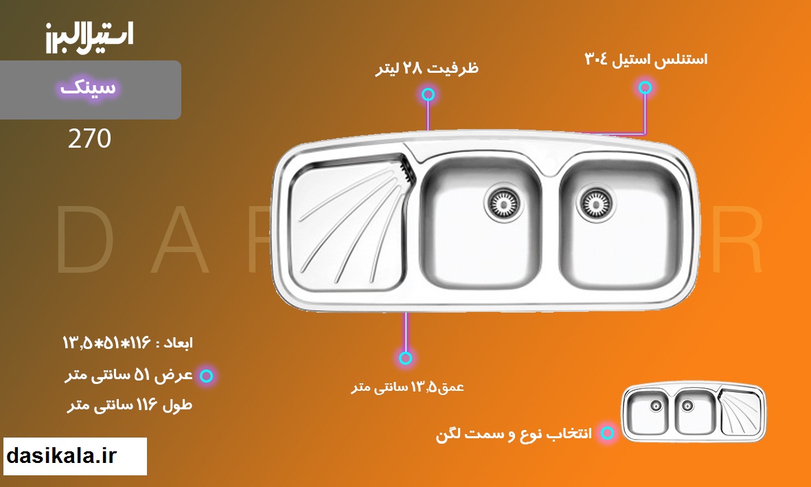 سینک توکار کد 270 استیل البرز، دارای سطحی یکپارچه با ظاهری براق و کیفیتی بی نظیر است. این سینک در افزایش عملکرد آشپزخانه مدرن شما تاثیر گذار است و به دلیل کیفیت مناسب، بیش از 20 سال به آشپزخانه شما خدمت میکند. دارای عمق 13.5 سانتی متر، ظرفیت 28 لیتر، ضخامت ورق 0.7 میلی متر، طول 116 و عرض 51 سانتی متر، یک سینی سر ریز طرح دار با شیب مناسب جهت تخلیه آب و دارای دو لگن در کنار هم است.